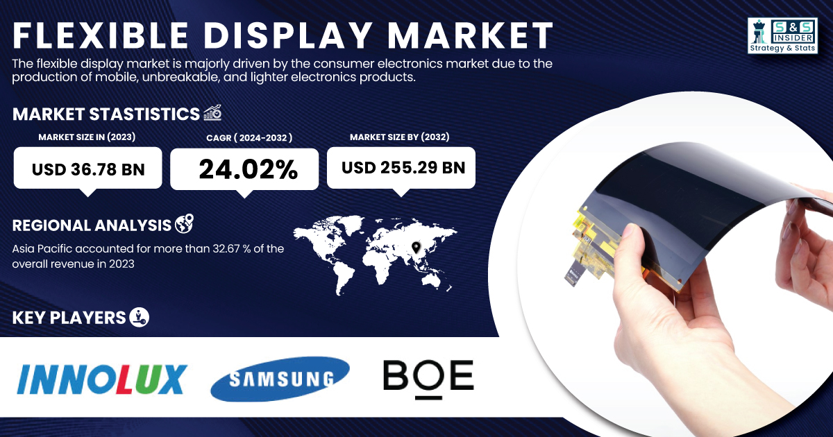 AUSTIN, TX, UNITED STATES, February 17, 2025 /EINPresswire.com/ -- Market Size & Industry InsightsAs Per the SNS Insider,“The Flexible Display market was valued at USD 36.78 billion in 2023 and is expected to grow to USD 255.29 billion by 2032, at a CAGR of 24.02% over the forecast period of 2024-2032.”