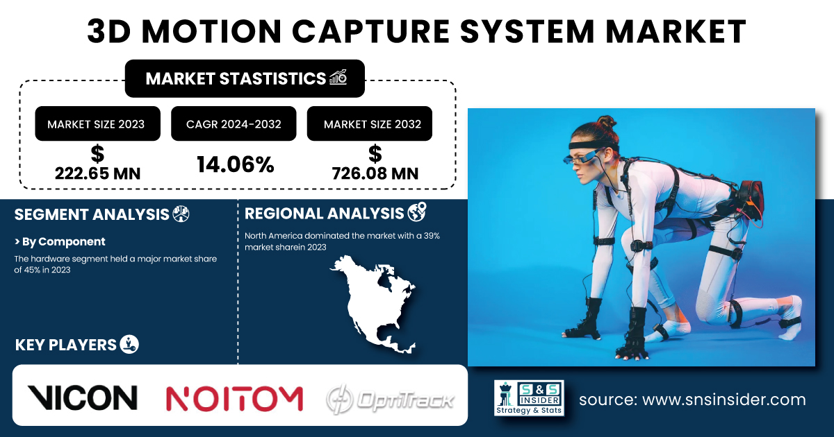 AUSTIN, TX, UNITED STATES, February 17, 2025 /EINPresswire.com/ -- Market Size & Industry InsightsAs Per the SNS Insider,“The 3D Motion Capture System Market size was valued at USD 222.65 Million in 2023 and is expected to reach USD 726.08 Million by 2032 and grow at a CAGR of 14.06% over the forecast period 2024-2032.”