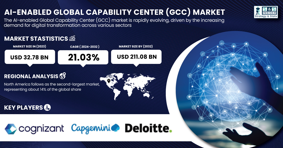 AI-enabled GCC Market was USD 32.78 Bn in 2023 and is projected to reach USD 211.08 Bn by 2032, growing at a 21.03% CAGR from 2024-2032, per SNS Insider.