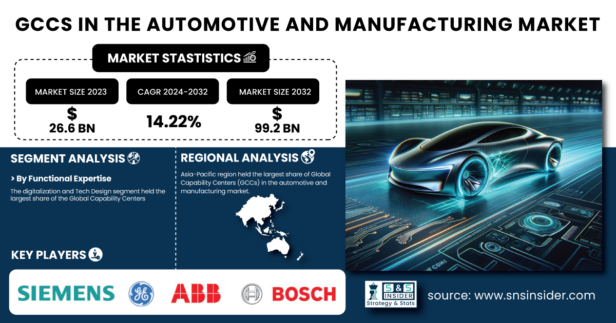 AUSTIN, TX, UNITED STATES, February 17, 2025 /EINPresswire.com/ -- According to the SNS Insider report, the GCCs in the Automotive and Manufacturing Market were valued at USD 26.6 billion in 2023 and are projected to reach USD 99.2 billion by 2032, growing at a CAGR of 14.22% from 2024 to 2032. The increasing adoption of digital twin technology, AI-driven automation, and the rise of Industry 4.0 is fueling the expansion of Global Capability Centers (GCCs) in the automotive and manufacturing sector.Get Sample Copy of Report: https://www.snsinsider.com/sample-request/4717