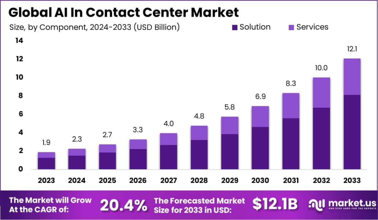 AI in Contact Center Market Boost By USD 12.1 billion by 2033, at a CAGR of 20.4%