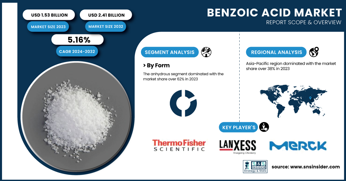AUSTIN, TX, UNITED STATES, February 18, 2025 /EINPresswire.com/ -- The benzoic acid market was valued at USD 1.53 billion in 2023 and is projected to reach USD 2.41 billion by 2032, growing at a CAGR of 5.16% from 2024 to 2032. The key factors contributing to the increasing demand for benzoic acid include the extensive application of benzoic acid as a preservative in the food and beverage industry. Benzoic acid is widely used in processed food, carbonated beverages, and bakery food to enhance shelf life and protect microorganisms due to its antimicrobial properties. Its use as an excipient along with its antifungal activity has also led to market growth in the pharmaceutical industry. All these factors supporting the market growth are likely to increase the demand for its wide industrial applications such as alkyd resins, plasticizers, and other specialty chemicals.Get a Sample Report of Benzoic Acid Market @ https://www.snsinsider.com/sample-request/3637