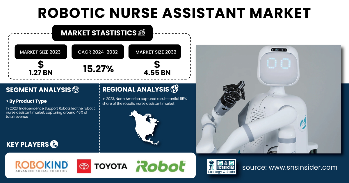 AUSTIN, TX, UNITED STATES, February 18, 2025 /EINPresswire.com/ -- According to Research by SNS Insider, The global Robotic Nurse Assistant Market, valued at USD 1.27 billion in 2023, is projected to reach USD 4.55 billion by 2032, expanding at a CAGR of 15.27% from 2024 to 2032.The robotic nurse assistant market is growing fast, spurred by a growing population and the development of automation. With healthcare systems under pressure, robotics are being introduced to improve efficiency and patient care. Hospitals that implement robotic solutions see considerable workflow gains, while automation powered by artificial intelligence assists in overcoming staffing shortages. As more interest is seen in robotic technology, continued investment and innovation will continue to change elder care and healthcare delivery over the next few years.