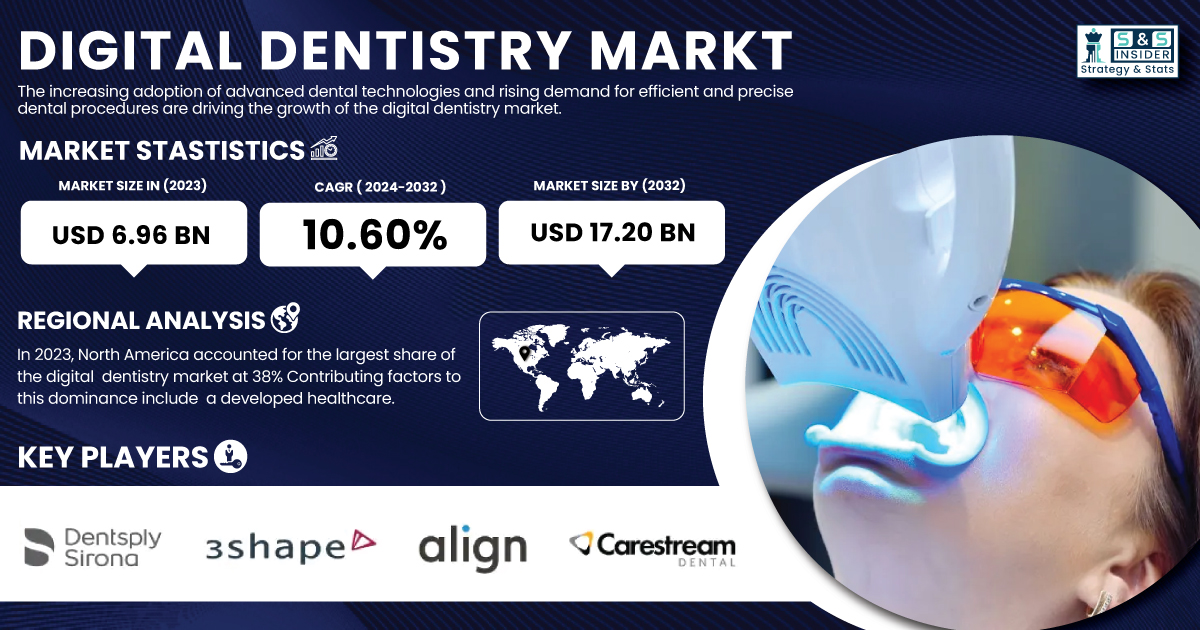 AUSTIN, TX, UNITED STATES, February 18, 2025 /EINPresswire.com/ -- According to Research by SNS Insider, The Digital Dentistry Market was valued at USD 6.96 billion in 2023 and is expected to reach USD 17.20 billion by 2032, growing at a robust CAGR of 10.60% over the forecast period from 2024 to 2032. The market's growth is driven by technological advancements in dental imaging, increased demand for precise dental treatments, and the shift toward digital solutions in dental practices.“The digital transformation in dentistry is redefining clinical workflows and patient care. AI-driven diagnostics and 3D printing are now industry game changers, ensuring unprecedented precision,” – SNS Insider