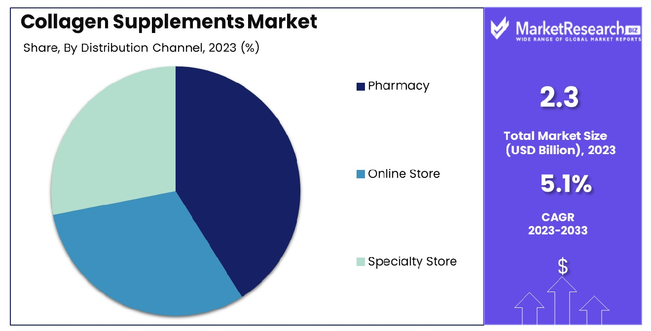 Collagen supplements are segmented by form, distribution channel, and region. By Form, they include Pills & Gummies, Powders, and Liquid/Drinks, with Pills & Gummies dominating due to their convenience and high consumer preference. The distribution Channel, is divided into Pharmacies, Online Stores, and Specialty Stores. Pharmacies lead the market, attributed to trusted healthcare consultations, whereas online sales are growing due to accessibility and diverse offerings. By Region, North America dominates with a 30.3% share due to robust infrastructure and high consumer awareness. Europe follows with steady growth fueled by an aging population, while Asia-Pacific shows significant potential driven by health consciousness and preventive health practices. These segments facilitate targeted marketing strategies, helping industry players optimize product placement and customer reach across diverse consumer bases and needs.