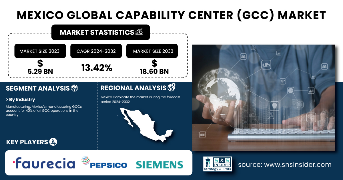 AUSTIN, TX, UNITED STATES, February 18, 2025 /EINPresswire.com/ -- The SNS Insider report indicates that the Mexico GCC Market size was valued at USD 5.29 billion in 2023 and is estimated to reach USD 18.60 billion by 2032, growing at a CAGR of 13.42% from 2024 to 2032. The market is growing due to the rapid expansion of the automotive and manufacturing industries in Mexico, coupled with the increased adoption of digital transformation technologies.Get Sample Copy of Report: https://www.snsinsider.com/sample-request/4705