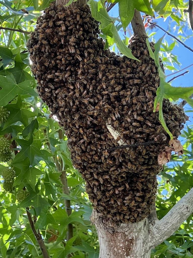 A dense swarm of bees has clustered on a wooden beam, forming a temporary hive before professional removal by O.C. Bee Guy.