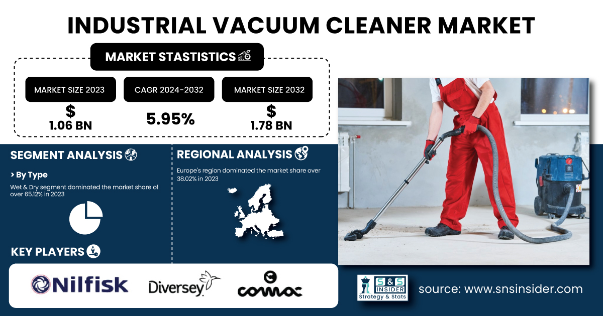 AUSTIN, TX, UNITED STATES, February 19, 2025 /EINPresswire.com/ -- The SNS Insider report indicates that the Industrial Vacuum Cleaner Market size was estimated at USD 1.06 Billion in 2023 and is expected to reach USD 1.78 Billion by 2032 at a Compound Annual Growth Rate of 5.95% during the forecast period of 2024-2032. Due to the increasing demand for cleanliness, efficiency, and compliance with stringent hygiene regulations, the Industrial Vacuum Cleaner Market is experiencing robust growth. The expanding industrial automation, coupled with rising concerns about workplace safety and sanitation, is driving this demand.Get a Sample Report of Industrial Vacuum Cleaner Market @ https://www.snsinsider.com/sample-request/3665