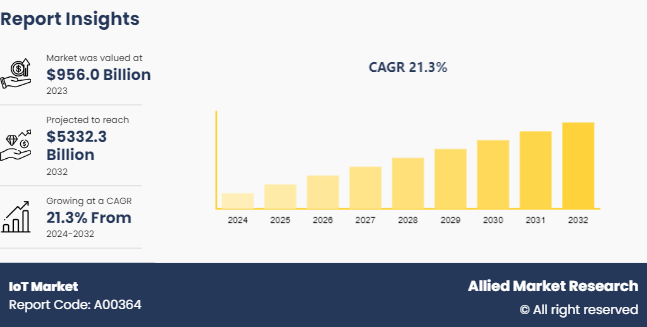 WILMINGTON, DE, UNITED STATES, February 20, 2025 /EINPresswire.com/ -- According to the report published by Allied Market Research, The IoT Market Size Projected to Reach USD 5,332.3 Billion by 2032 Growing at a CAGR of 21.3%. The report provides an extensive analysis of changing market dynamics, major segments, value chain, competitive scenario, and regional landscape. This research offers valuable able guidance to leading players, investors, shareholders, and startups in devising strategies for sustainable growth and gaining a competitive edge in the market.The global IoT market size was valued at $956.0 billion in 2023, and is projected to reach $5,332.3 billion by 2032, growing at a CAGR of 21.3% from 2024 to 2032.