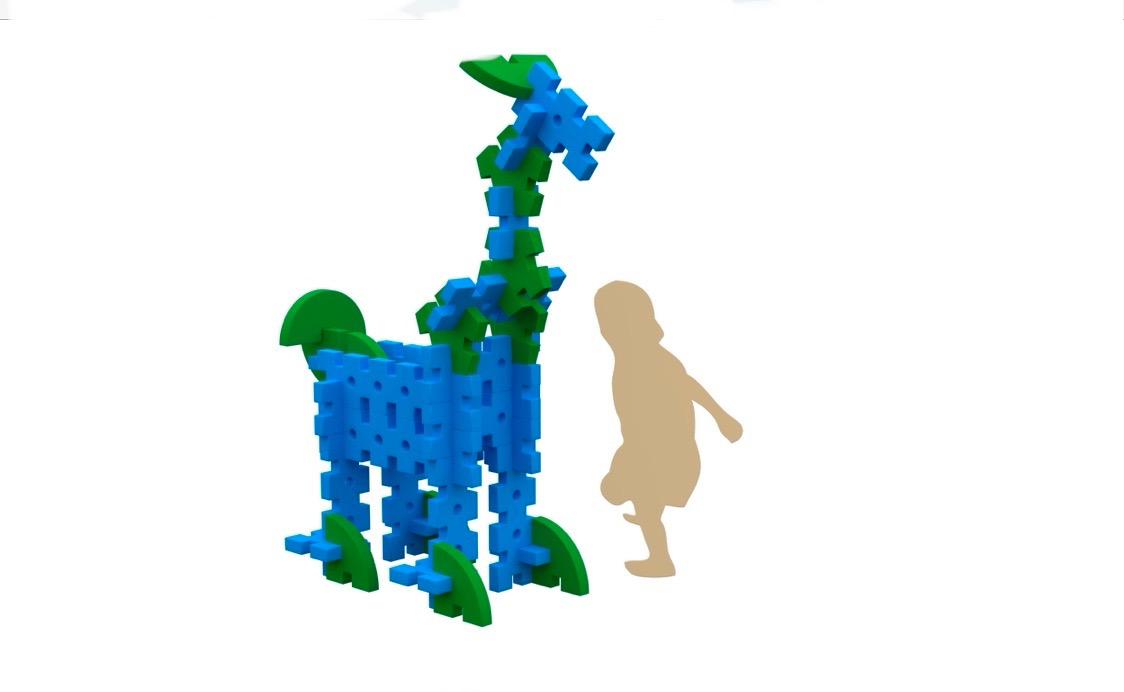 As the BIG LINK block set progressed through its prototype phase it was decided it's all about 14 new and unique connecting shapes - and about attaching, or joining, and fastening, or coupling, and hitching or bolting - all that. It's all about linking the block pieces into as many creative possibilities as a young mind can imagine. Through our testing phase we noticed that these blocks best suited older children, ages 4 through 10, and highly complimented theme based play, and more guided approach to building projects. The children loved to make vehicles like autos, airplanes, trains, helicopters (see photo) - they made animals like elephants, tigers, a giraffe (see photo - maybe it's a dragon?) - they made creatures like robots and monsters - they made big block girls and boys - they made city buildings and country ranches", he continues.