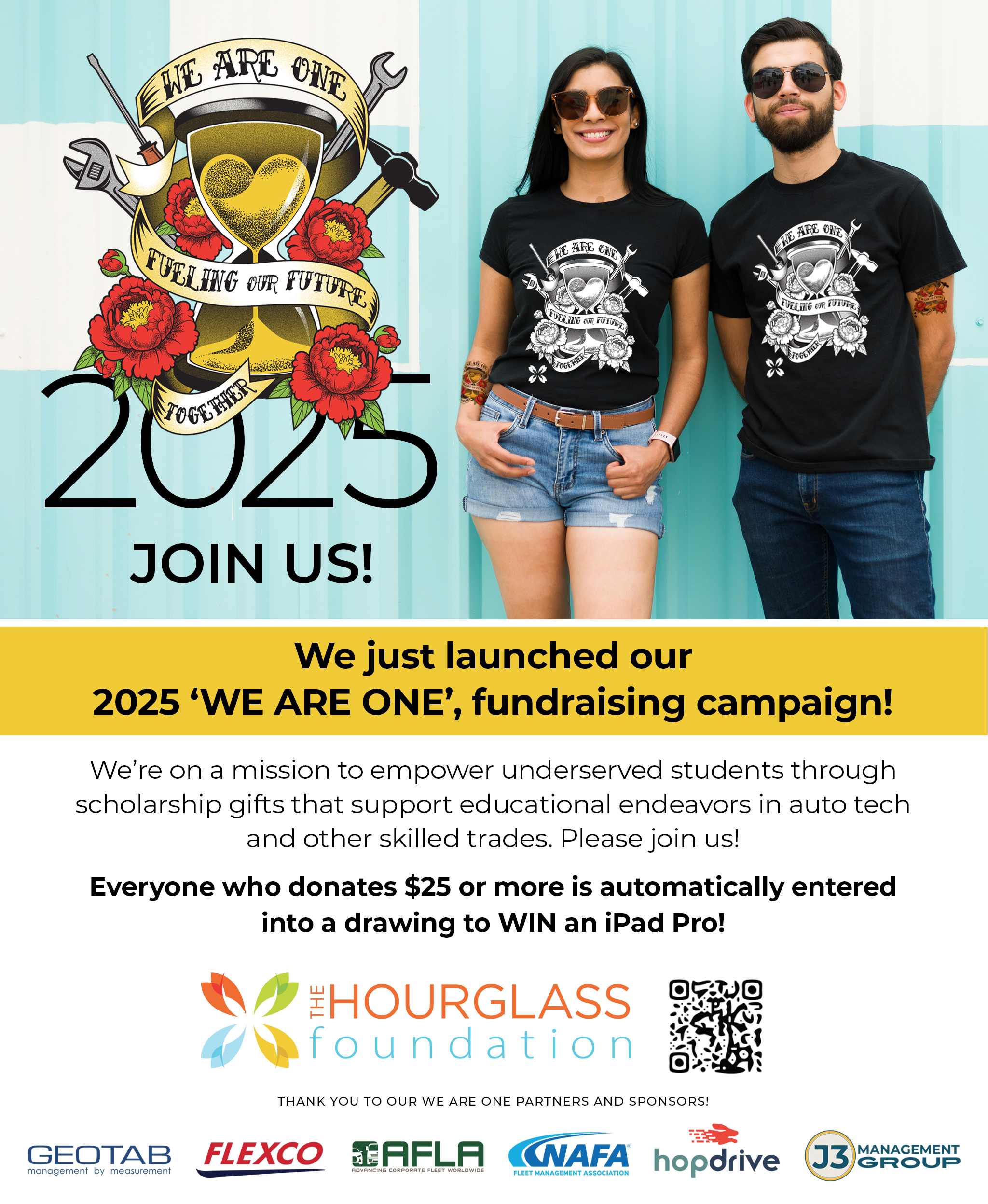 The Hourglass Foundation’s We Are One campaign is in partnership with NAFA Fleet Management Association, Automotive & Fleet Leasing Association (AFLA), Geotab, and Flexco Fleet Services, and sponsored in part by HopDrive and J3 Management Group. As part of the overall fundraiser, the Foundation hopes to raise $40,000+ for future scholarship gifts.