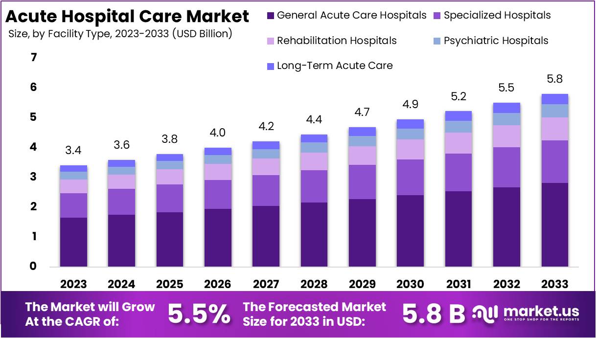 Acute Hospital Care Market Size is expected to reach USD 5.8 billion by 2033 from USD 3.4 bn in 2023, growing at a CAGR of 5.5%.