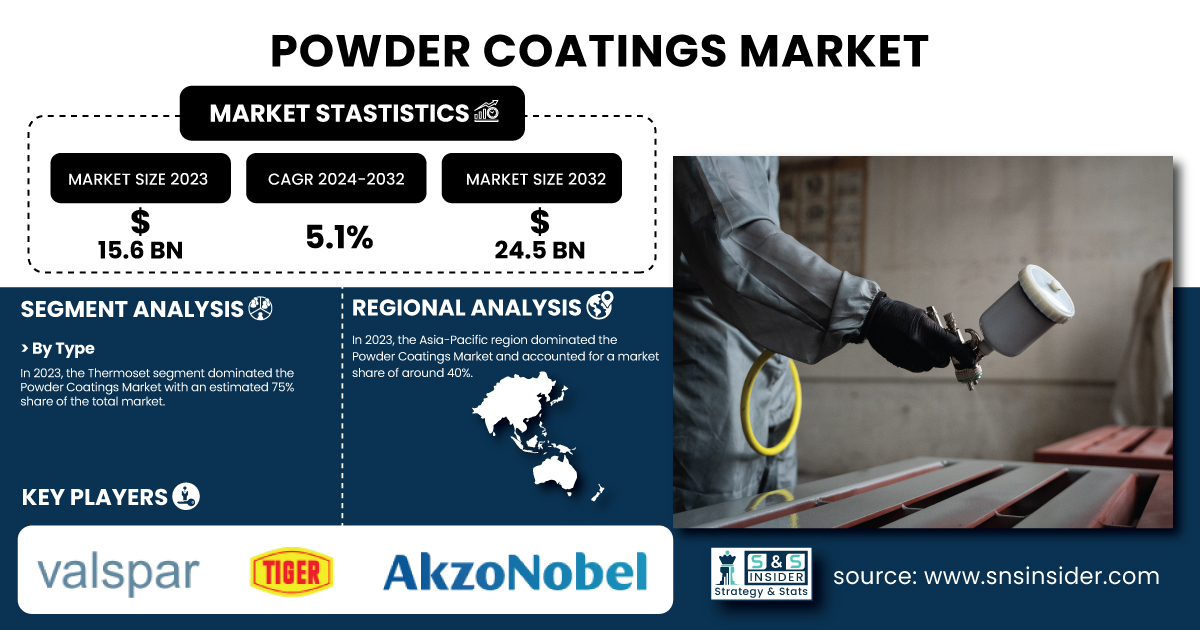 AUSTIN, TX, UNITED STATES, February 20, 2025 /EINPresswire.com/ -- The powder coatings market was valued at USD 15.6 billion in 2023 and is projected to reach USD 24.5 billion by 2032, growing at a CAGR of 5.1% from 2024 to 2032. The increasing demand for economical, solvent-free, and long-lasting coatings. Powder coatings provide enhanced anti-corrosive properties, better durability, and excellent finishing properties for products after curing, which drives industries to choose powder coatings to simultaneously provide aesthetic and durable protection for their products. Moreover, strict environmental regulations restricting volatile organic compound (VOC) emissions have compelled manufacturers to switch to powder coatings to achieve a sustainable substitute for traditional liquid coatings. Powder coatings are recyclable and efficient have bolstered their use among industries.Get a Sample Report of Powder Coatings Market @ https://www.snsinsider.com/sample-request/1815
