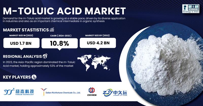 AUSTIN, TX, UNITED STATES, February 20, 2025 /EINPresswire.com/ -- The m-Toluic Acid Market Size was valued at USD 1.7 Billion in 2023 and is expected to reach USD 4.2 Billion by 2032, growing at a CAGR of 10.8% over the forecast period of 2024-2032.The increasing use of m-Toluic Acid in pharmaceuticals, insect repellents, and dyes guides its market growth. European Chemicals Agency (ECHA) identifies it as a key chemical component of several products. It is also enhancing the growth of the market as sustainable formulations are being made from m-Toluic Acid for environmentally friendly insect repellents and those products targeting health purposes like supplements and cosmetics thereby supporting the increasing demand for environmentally safe and health-oriented solutions.