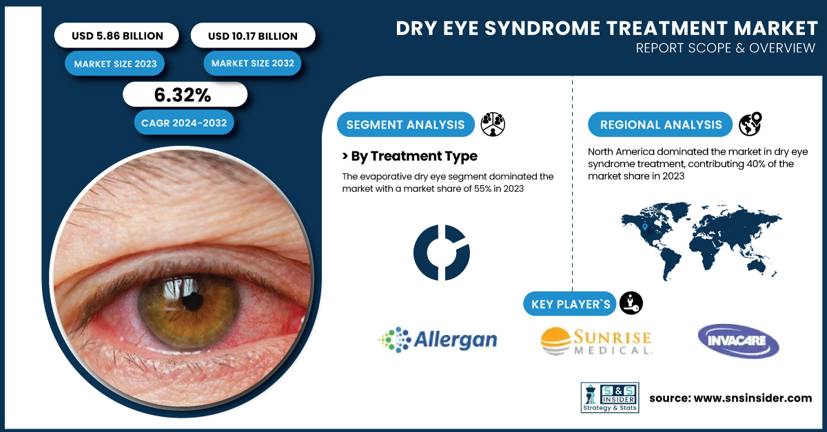 AUSTIN, TX, UNITED STATES, February 20, 2025 /EINPresswire.com/ -- According to Research by SNS Insider,The Dry Eye Syndrome Treatment Market was estimated at USD 5.86 billion in 2023 and is expected to reach USD 10.17 billion by 2032, at a CAGR of 6.32% during the forecast period of 2024-2032.The Dry Eye Syndrome Treatment Market is expanding with the increasing prevalence of dry eye disease, fueled by reasons like increased screen time, aging, and co-morbidities. This has created a higher demand for novel treatments like lipid-based eye drops and new drug-device therapies. Progress in AI diagnostics, portable treatment devices, and FDA approvals are driving research faster, while collaborations in the industry are broadening the pipeline for better solutions.