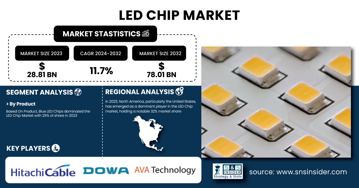 AUSTIN, TX, UNITED STATES, February 20, 2025 /EINPresswire.com/ -- Market Size & Industry InsightsAs Per the SNS Insider,“The LED Chip market was valued at USD 28.81 billion in 2023 and is expected to grow to USD 78.01 billion by 2032, at a CAGR of 11.7% over the forecast period of 2024-2032.”
