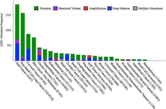 The alteration frequency including mutations, structural variants, amplifications, deep deletions, and multiple alterations of LKB1 in tumors. Listed in descending prevalence are LKB1 genetic alterations with the number of genetic alterations and total sp