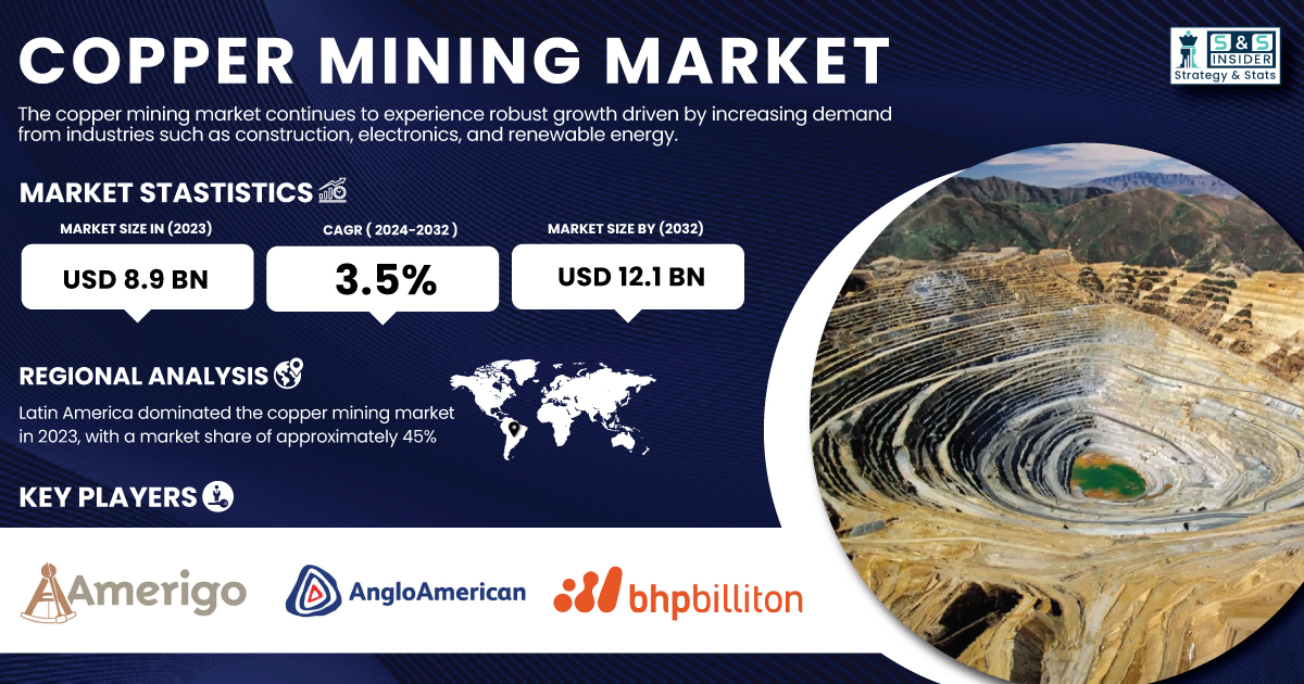 AUSTIN, TX, UNITED STATES, February 21, 2025 /EINPresswire.com/ -- The copper mining market was valued at USD 8.9 billion in 2023 and is projected to reach USD 12.1 billion by 2032, growing at a CAGR of 3.5% from 2024 to 2032. The rise in urbanization, expanding power grids, and the increasing adoption of electric vehicles (EVs) are the primary market growth drivers. This transition to low-carbon energy continues to drive growth as copper usage in solar panels, wind turbines, and energy storage rises rapidly. Furthermore, the implementation of automation and digital technologies in mining operations is increasing efficiency and reducing costs.Get a Sample Report of Copper Mining Market @ https://www.snsinsider.com/sample-request/5562