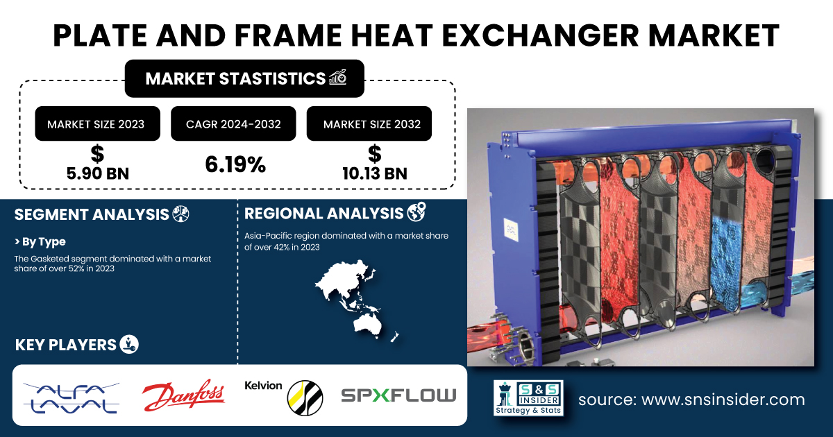 AUSTIN, TX, UNITED STATES, February 21, 2025 /EINPresswire.com/ -- The SNS Insider report indicates that the Plate and Frame Heat Exchanger Market Size was esteemed at USD 5.90 billion in 2023 and is supposed to arrive at USD 10.13 billion by 2032 with a growing CAGR of 6.19% over the forecast period 2024-2032. The increasing emphasis on energy conservation and the adoption of sustainable heat exchange technologies across industrial sectors are driving significant growth in the Plate and Frame Heat Exchanger Market. With industries striving to optimize thermal management and reduce carbon footprints, these heat exchangers are witnessing high demand across various applications, including HVAC, power generation, chemical processing, and food & beverages.Get a Sample Report of Plate and Frame Heat Exchanger Market @ https://www.snsinsider.com/sample-request/5713