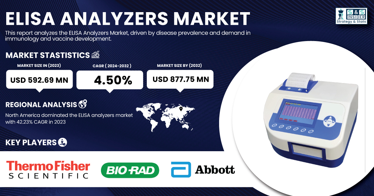 AUSTIN, TX, UNITED STATES, February 21, 2025 /EINPresswire.com/ -- According to Research by SNS Insider, The global ELISA Analyzers market was valued at USD 592.69 million in 2023 and is projected to reach USD 877.75 million by 2032, growing at a CAGR of 4.50% during the forecast period from 2024-2032.Market Analysis