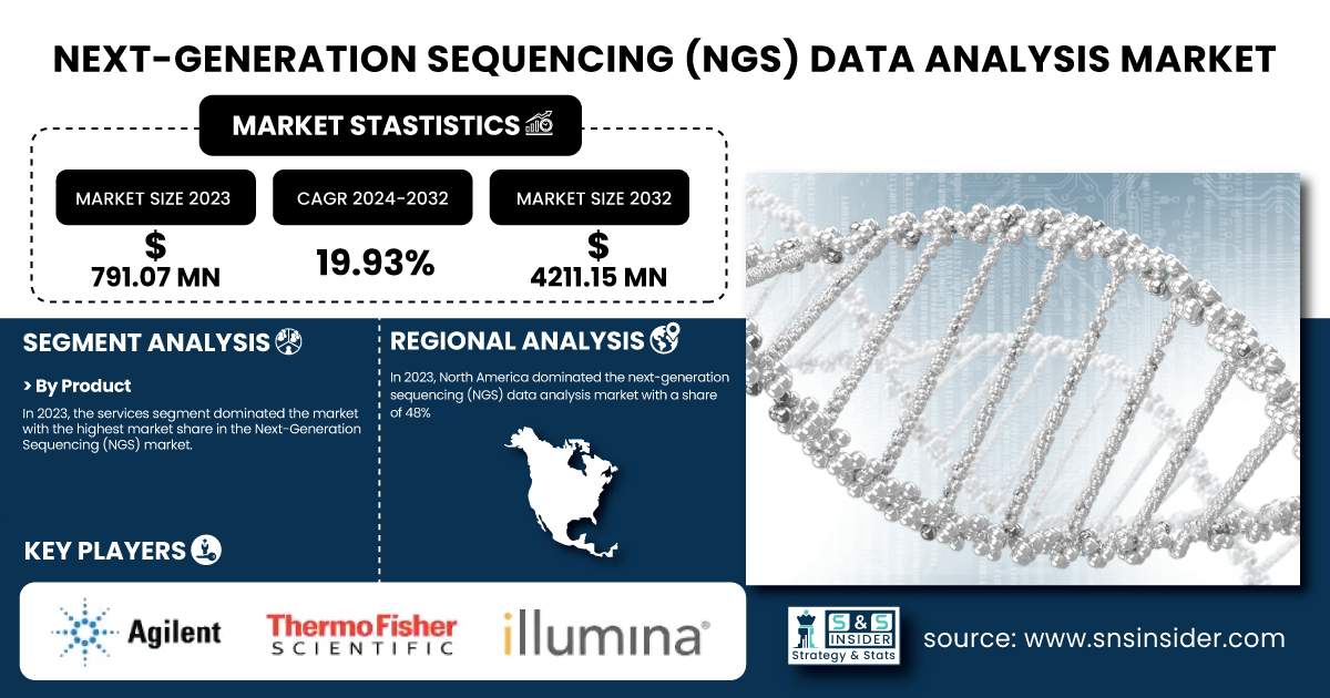 AUSTIN, TX, UNITED STATES, February 21, 2025 /EINPresswire.com/ -- According to Research by SNS Insider, The Next-Generation Sequencing (NGS) Data Analysis Market, valued at USD 791.07 million in 2023, is projected to reach USD 4211.15 million by 2032, expanding at a CAGR of 19.93% from 2024-2032, according to SNS Insider.The market is experiencing significant growth, driven by the increasing demand for advanced genomic data analysis tools across various sectors, including oncology, genetics, and drug development. NGS technology enables high-throughput sequencing, providing unparalleled speed and accuracy in analyzing DNA and RNA. This is revolutionizing personalized medicine, diagnostics, and molecular biology.