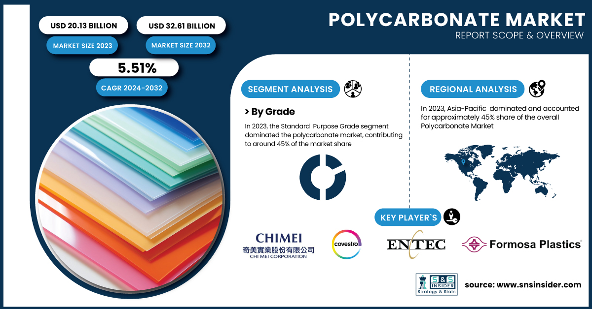 AUSTIN, TX, UNITED STATES, February 24, 2025 /EINPresswire.com/ -- The Polycarbonate Market Size was valued at 20.13 Billion in 2023 and is expected to reach USD 32.61 Billion by 2032, growing at a CAGR of 5.51% over the forecast period of 2024-2032.The polycarbonate market is witnessing significant growth due to its wide application in industries such as automotive, electrical & electronics, and construction. Polycarbonate is widely recognized for its superior properties, including high impact resistance, optical clarity, and thermal stability, making it an essential material for various end-use applications. According to the U.S. International Trade Commission (USITC), polycarbonate exports from the United States increased by 12% in 2023, reflecting robust demand across global markets. Additionally, in 2022, Covestro AG announced the expansion of its polycarbonate production capacity in Shanghai to meet the rising demand in Asia. Furthermore, major automotive manufacturers such as BMW and Tesla are increasingly incorporating polycarbonate materials in vehicle components to enhance durability and reduce vehicle weight. With growing investments in research and development, along with the rising adoption of sustainable polycarbonate materials, the market is poised for robust growth in the coming years.