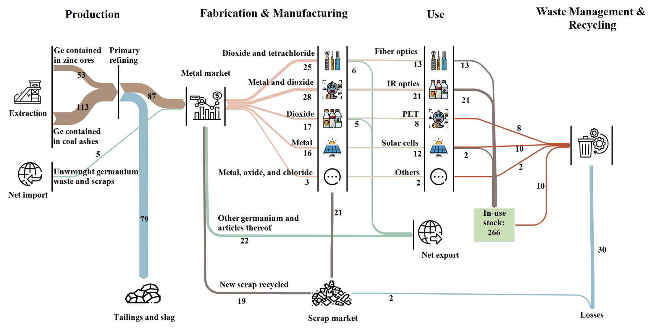 Germanium (Ge), a key semiconducting element, plays an essential role in industries ranging from fiber optics to solar cells. China, which produces 68% of the world's refined Ge, faces an unsustainable production model primarily dependent on zinc refining and coal ash. With global recovery rates of only 3%-5%, the country faces a growing demand-supply imbalance. This situation calls for urgent research to explore ways to enhance recycling and optimize resource use within the Ge supply chain.