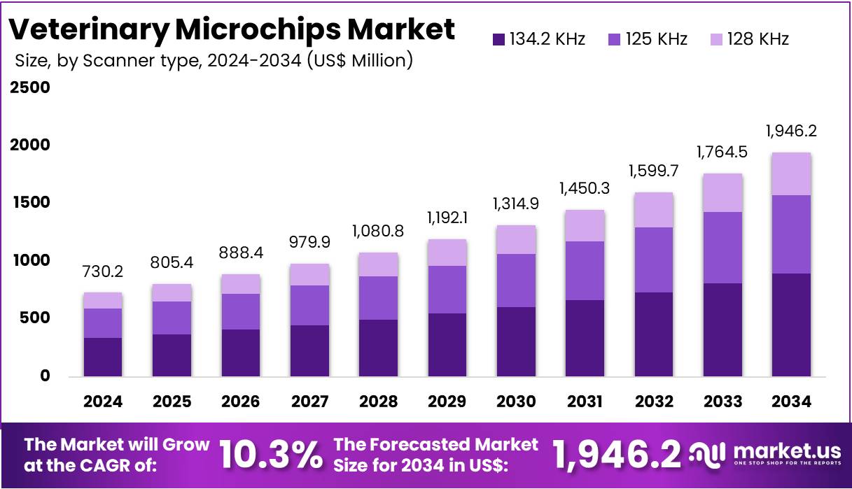 NEW YORK, NY, UNITED STATES, February 24, 2025 /EINPresswire.com/ -- The Global Veterinary Microchips Market is projected to grow significantly, reaching US$ 1.95 billion by 2034, up from US$ 730.2 million in 2024. This expansion represents a CAGR of 10.3% from 2025 to 2034. The demand for microchips is increasing due to their effectiveness in pet identification and the growing number of pet adoptions worldwide. As more pet owners seek secure and permanent identification methods, the adoption of veterinary microchips is rising. These tiny implants provide essential identification details, significantly increasing the chances of reuniting lost pets with their owners. Studies show that microchipped dogs have a 52% return rate, while non-microchipped dogs have only a 22% return rate. Similarly, microchipped cats have a 38% return rate, compared to 2% for non-microchipped cats.Government regulations are playing a crucial role in market growth. Many countries have mandated pet microchipping, making it compulsory for pet owners. These laws ensure that pets are easily identifiable, reducing the burden on animal shelters and improving pet recovery rates. Regulatory initiatives in Europe, the U.S., and parts of Asia are pushing microchip adoption. Such legal requirements drive higher demand for veterinary microchips, as pet owners comply with regulations to avoid fines and ensure their pets' safety. This enforcement increases awareness and encourages responsible pet ownership, further fueling market growth.