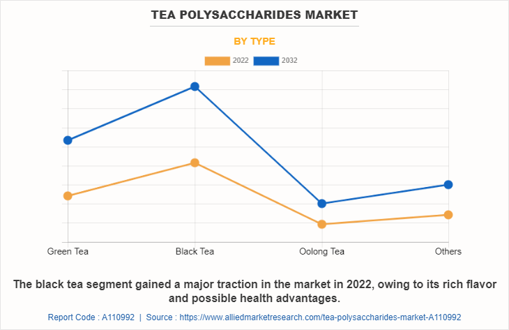 The expanding recognition of the medicinal perks linked with the utilisation of tea polysaccharides has accelerated the sales and requirement for tea polysaccharides. Customers are growing increasingly conscious of the possibly advantageous health benefits of tea polysaccharides, which encourages individuals to explore out products containing tea polysaccharides. Tea polysaccharides are gaining prominence due to their multiple health advantages, such as antimicrobial, anti-inflammatory, and immune-enhancing effects.
