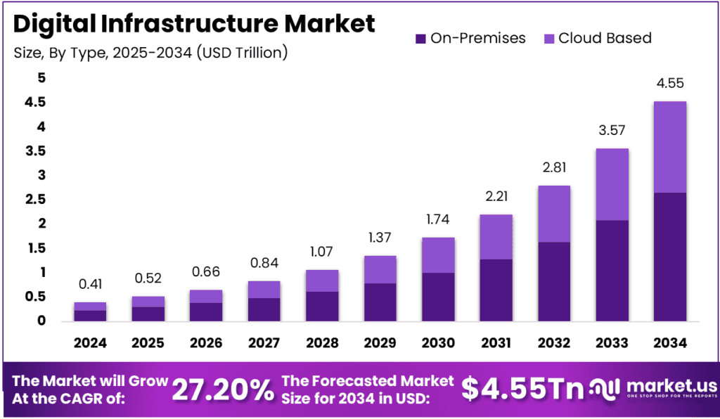 デジタルインフラストラクチャ市場の価値は、2024年の0.41兆米ドルから2034年までに約4.55兆米ドルに達すると予想されています