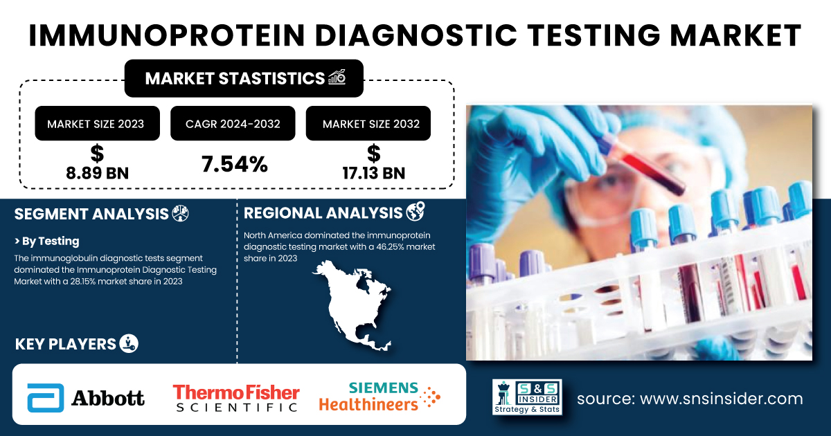 AUSTIN, TX, UNITED STATES, February 25, 2025 /EINPresswire.com/ -- According to SNS Insider, the Immunoprotein Diagnostic Testing Market was valued at USD 8.89 billion in 2023 and is projected to grow at a CAGR of 7.54% to reach USD 17.13 billion by 2032.The Immunoprotein Diagnostic Testing Market is riding on consistent growth, fueled by the increasing incidence of immunological disorders, infectious diseases, and cancer. Growing demand for early disease detection, innovations in immunoassay technologies, and increasing point-of-care diagnostics adoption are major drivers. Growing healthcare infrastructure, especially in developing economies, also boosts market growth. Furthermore, increased healthcare expenditure and government programs drive greater access to and use of immunoprotein diagnostic testing worldwide.
