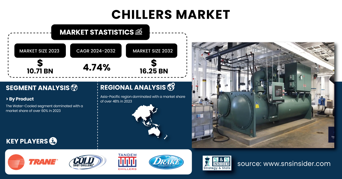 AUSTIN, TX, UNITED STATES, February 26, 2025 /EINPresswire.com/ -- According to the SNS Insider report, the Chillers Market was valued at USD 10.71 billion in 2023 and is projected to reach USD 16.25 billion by 2032, exhibiting a Compound Annual Growth Rate (CAGR) of 4.74% during the forecast period from 2024 to 2032. The Chillers Market is experiencing significant growth due to the increasing demand for energy-efficient cooling solutions across various industries, propelled by rapid urbanization, technological advancements, and stringent environmental regulations.Get a Sample Report of Chillers Market @ https://www.snsinsider.com/sample-request/5669