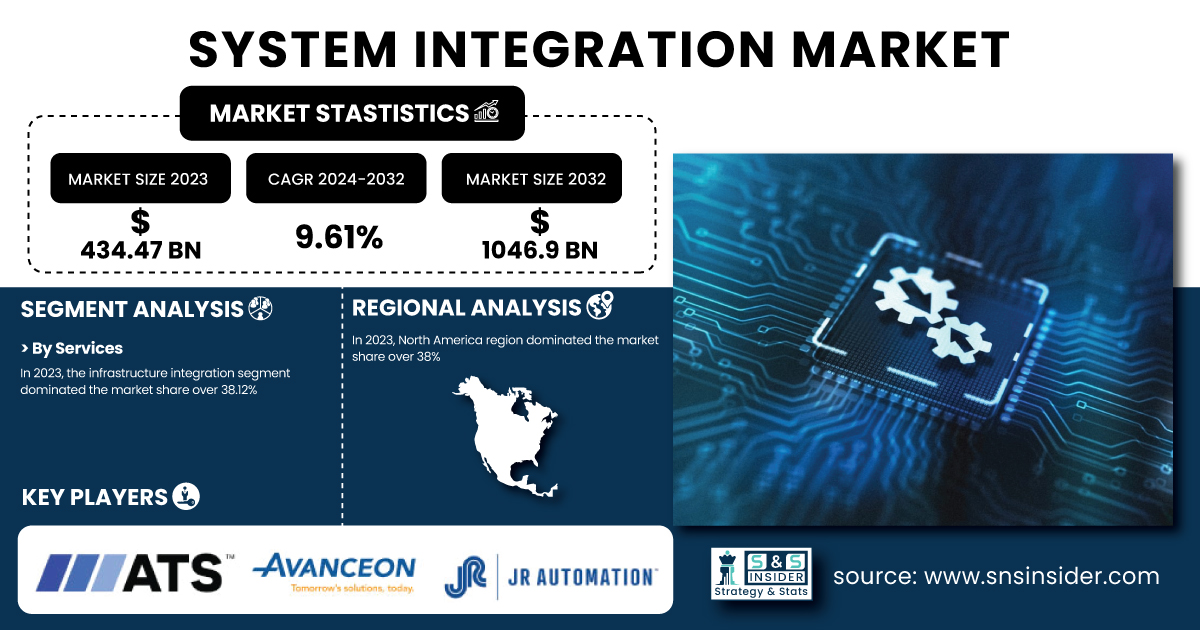 AUSTIN, TX, UNITED STATES, February 27, 2025 /EINPresswire.com/ -- The System Integration Market was valued at USD 434.47 billion in 2023 and is projected to reach USD 1046.9 billion by 2032, growing at a CAGR of 9.61% from 2024 to 2032. This growth includes rising adoption rates of emerging technologies, continuous network infrastructure expansion, increasing cybersecurity incidents, and growing cloud services usage across regions. The market is driven by the demand for seamless IT integration, automation, and enhanced security solutions, making system integration essential for digital transformation across industries.Get Sample Copy of Report: https://www.snsinsider.com/sample-request/4826