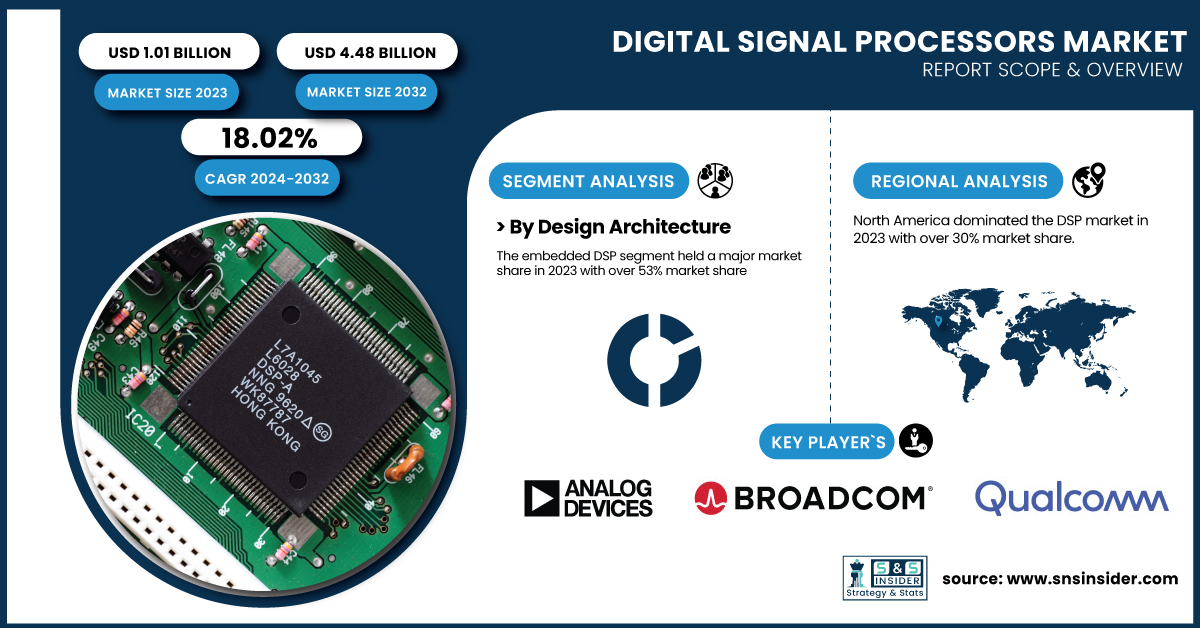 AUSTIN, TX, UNITED STATES, February 27, 2025 /EINPresswire.com/ -- Market Size & Industry InsightsAs Per the SNS Insider,“The digital signal processors market, valued at USD 1.01 billion in 2023, is expected to reach USD 4.48 billion by 2032, growing at a CAGR of 18.02%.”