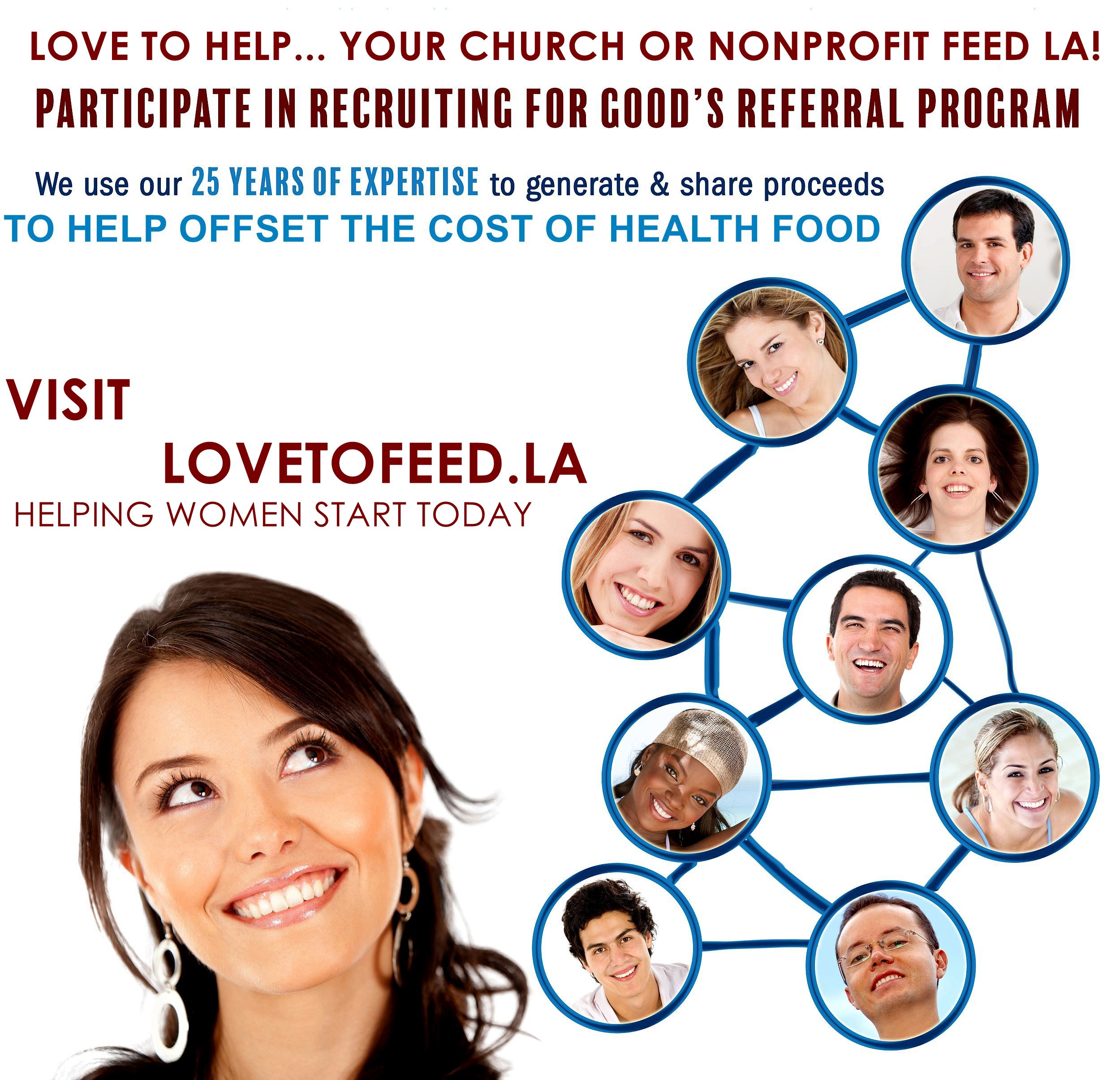 Love to Feed LA? Helping women start Today. Participate in referral program to fund healthy food supermarket gift cards to be donated to a food program managed by a church, nonprofit, or school (PTA).