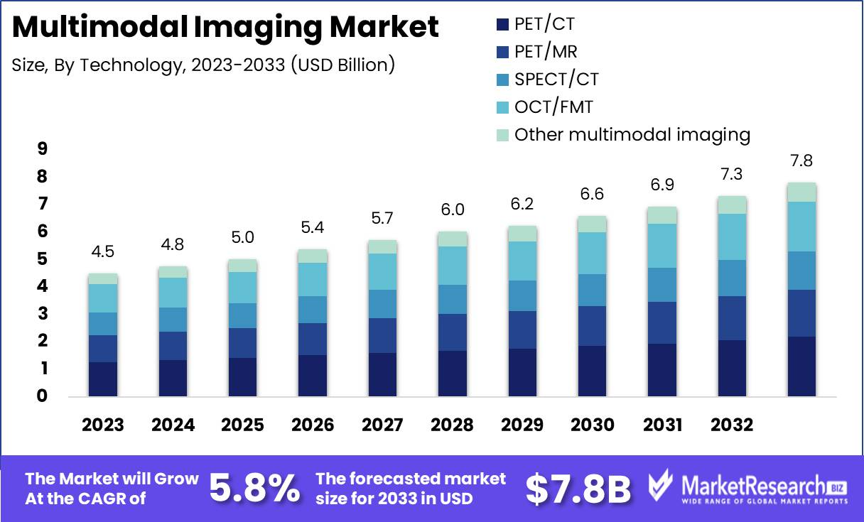 NEW YORK, NY, UNITED STATES, February 28, 2025 /EINPresswire.com/ -- The Global Multimodal Imaging Market was valued at USD 4.5 billion in 2023 and is projected to reach USD 7.8 billion by 2033, growing at a CAGR of 5.8% during the forecast period from 2024 to 2033. This growth is primarily driven by the integration of diverse data modalities, including medical imaging, electronic health records, and sensor data, into healthcare practices. This integration enhances diagnostic accuracy and improves patient outcomes by providing a comprehensive view of patient health.Significant advancements in Artificial Intelligence (AI) have propelled the multimodal imaging sector forward. The adoption of large language models and multimodal AI technologies allows for more effective processing and integration of varied data types. These technologies improve the analysis of medical images and facilitate the concurrent use of textual and sensory data, which enhances diagnostic and treatment capabilities.