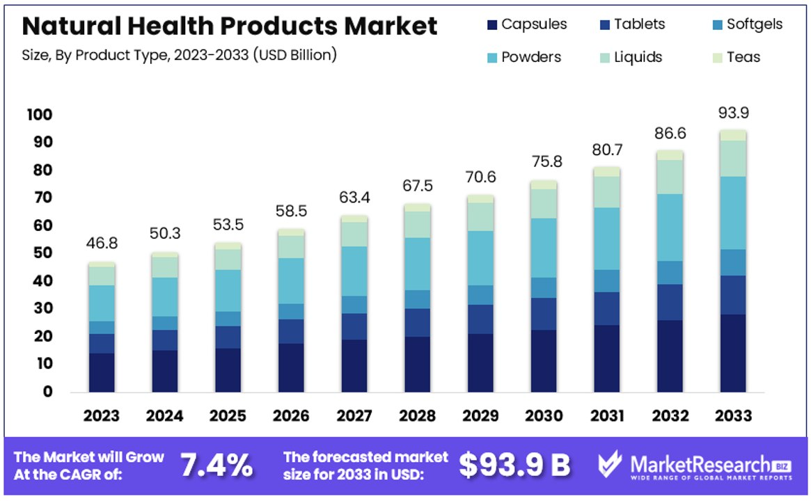 NEW YORK, NY, UNITED STATES, February 28, 2025 /EINPresswire.com/ -- The Global Natural Health Products Market is projected to double from USD 46.8 billion in 2023 to USD 93.9 billion by 2033, with a consistent annual growth rate of 7.4%. This growth is fueled by a marked shift towards preventive healthcare and heightened consumer interest in wellness. As individuals increasingly choose natural and organic products to bolster health, this sector is seeing significant expansion. The trend is underpinned by an expanding corpus of research that validates the effectiveness of natural products in preventing disease and enhancing health.Regulatory frameworks, particularly in the U.S., have evolved to better define and regulate natural health products. Standardization efforts by bodies such as the USDA and FDA have been pivotal in ensuring product quality and safety, thereby building consumer trust and broadening market reach. Concurrently, technological advancements in extraction and production processes have enabled more efficient and scalable production, maintaining the bioactivity of natural compounds and expanding the variety and availability of products.