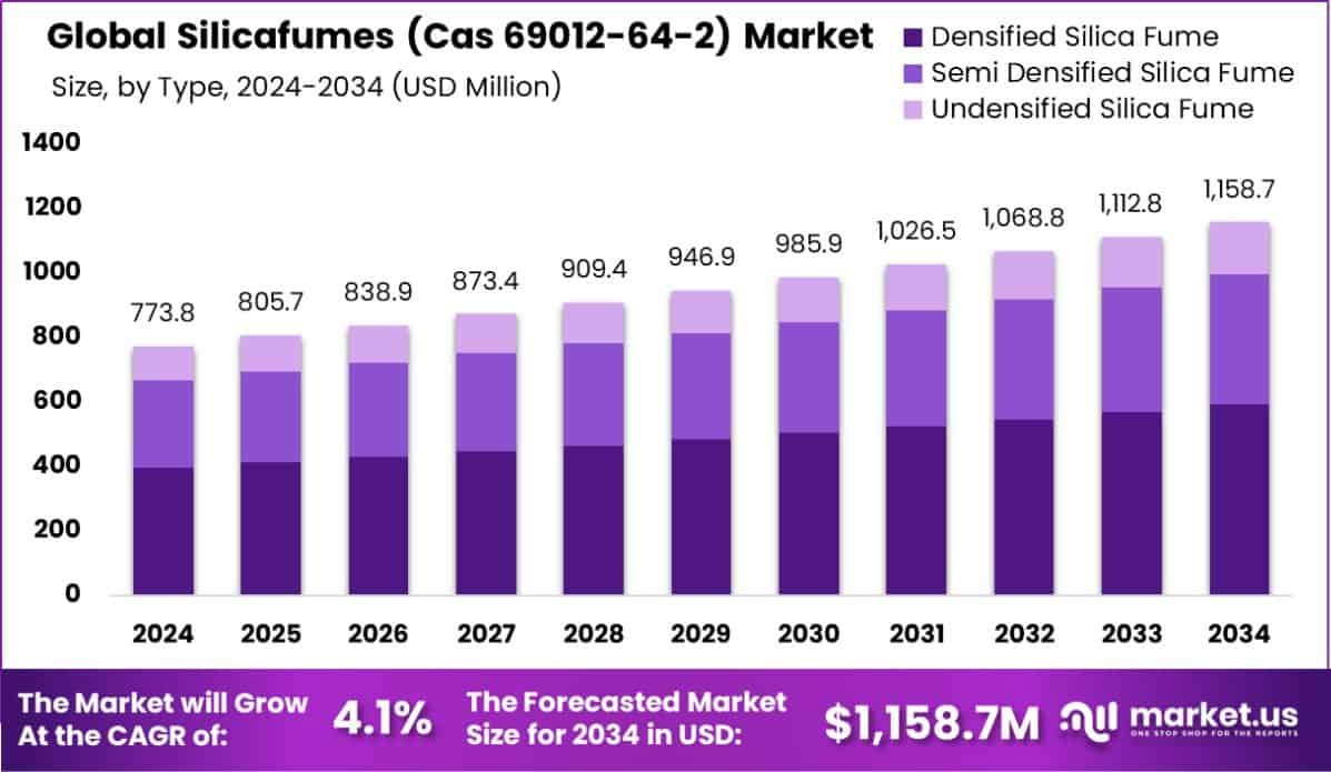Silicafumes (Cas 69012-64-2) Market is expected to be worth around USD 1,158.7 Million by 2034, up from USD 733.8 Million in 2024, and grow at a CAGR of 4.1%