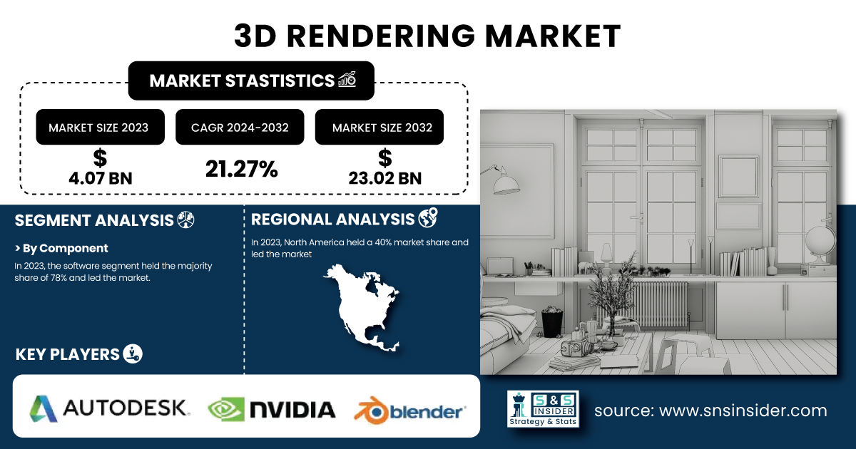 AUSTIN, TX, UNITED STATES, February 28, 2025 /EINPresswire.com/ -- “The 3D rendering market is growing rapidly, driven by AR/VR adoption, demand in gaming, architecture, and automotive, and advances in software.”The 3D rendering market, valued at USD 4.07 billion in 2023, is projected to reach USD 23.02 billion by 2032, growing at a 21.27% CAGR. Increased usage of AR and VR, with more than 1.4 billion currently active AR devices as of 2023, paired with advancements in rendering software and hardware, is driving growth. E-commerce, for instance, uses 3D visualization to engage better with customers, while companies in the automotive industry use it to create virtual prototypes and build marketing content. This catapults growth further due to the requirement for immersive experiences in entertainment, automotive, and online retail. Digital transformation is only accelerating, and 3D rendering will serve a key function across industries.
