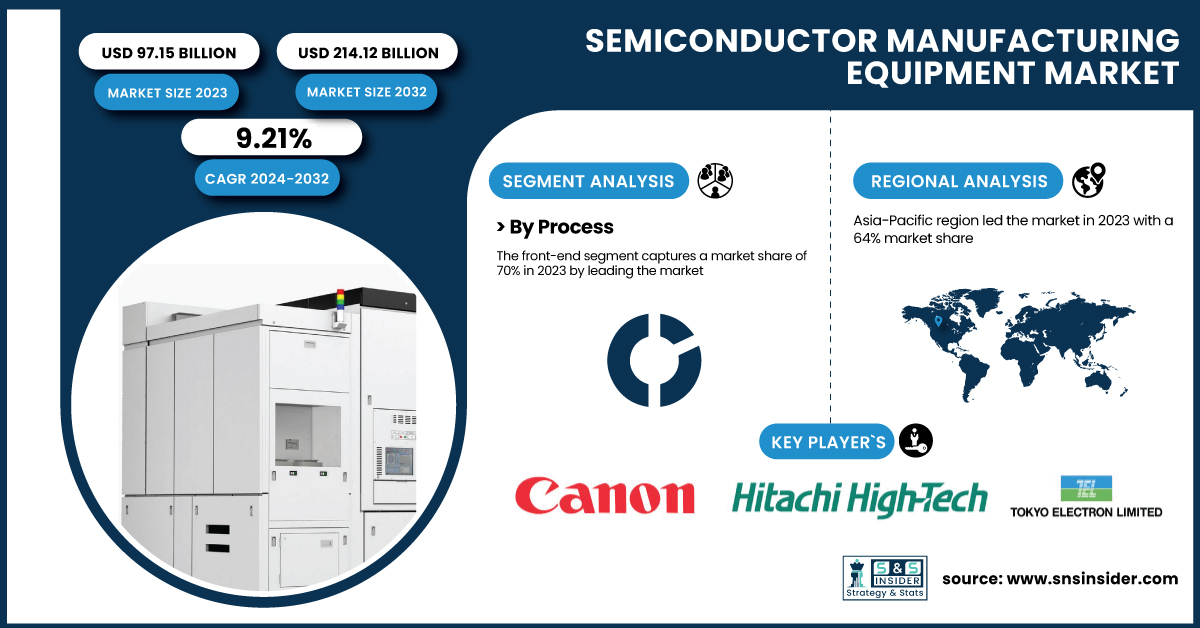 AUSTIN, TX, UNITED STATES, February 28, 2025 /EINPresswire.com/ -- Market Size & Industry InsightsAs Per the SNS Insider,“The Semiconductor Manufacturing Equipment market was valued at USD 97.15 billion in 2023 and is expected to grow to USD 214.12 billion by 2032, at a CAGR of 9.21% over the forecast period of 2024-2032.”