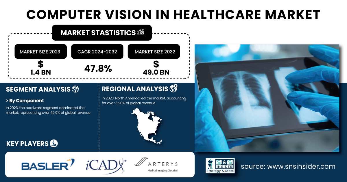 AUSTIN, TX, UNITED STATES, February 28, 2025 /EINPresswire.com/ -- According to Research by SNS Insider, The Computer Vision in Healthcare Market was valued at USD 1.4 billion in 2023 and is projected to reach USD 49.0 billion by 2032, growing at an impressive rate over the forecast period from 2024 to 2032.The growth of this market is fueled by the increasing adoption of artificial intelligence (AI) in medical diagnostics, advancements in imaging technologies, and the rising need for automation in healthcare. The integration of AI-driven computer vision enhances diagnostic accuracy and facilitates early disease detection, driving significant market demand.