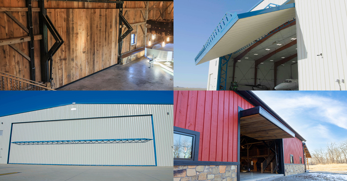 Kinze Offset-Pivot Hydraulic Door, available in 40' to 120' widths and heights up to 30'. built for production facilities, machine sheds, and aircraft hangars.