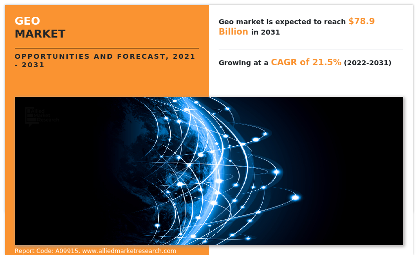 WILMINGTON, DE, UNITED STATES, March 3, 2025 /EINPresswire.com/ -- As per the report published by Allied Market Research, the global geomarketing market was pegged at $11.4 billion in 2021, and is expected to reach $78.9 billion by 2031, growing at a CAGR of 21.5% from 2022 to 2031. The report provides an in-depth analysis of top segments, changing market trends, value chains, key investment pockets, competitive scenarios, and regional landscapes. The report is an essential and helpful source of information for leading market players, investors, new entrants, and stakeholders in formulating new strategies for the future and taking steps to strengthen their position in the market.Download Sample Report (Get Full Insights in PDF - 343 Pages) at: https://www.alliedmarketresearch.com/request-sample/A09915