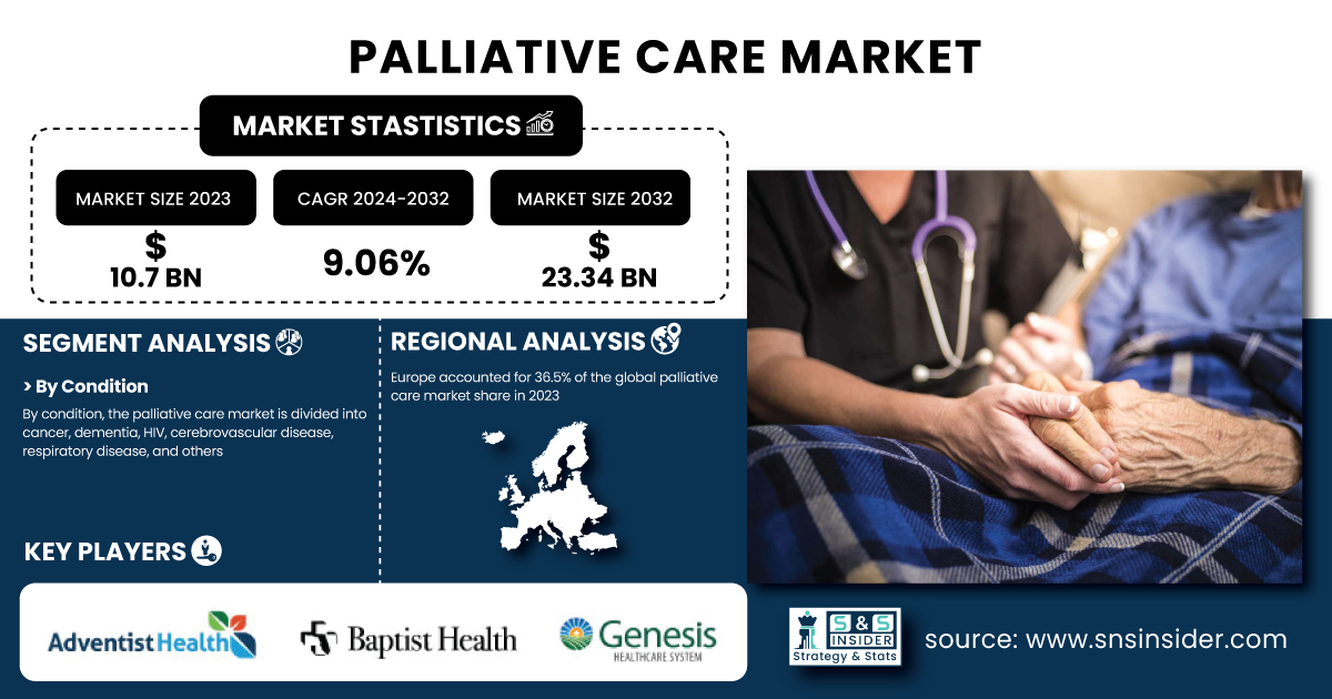 AUSTIN, TX, UNITED STATES, March 3, 2025 /EINPresswire.com/ -- According to Research by SNS Insider, The Palliative Care Market was valued at USD 10.7 billion in 2023 and is projected to reach USD 23.34 billion by 2032, growing at a CAGR of 9.06% during the forecast period of 2024-2032. The global palliative care market is witnessing significant growth, driven by the rising demand for quality end-of-life care. Palliative care focuses on providing relief from the symptoms and stress of serious illnesses.Market analysis