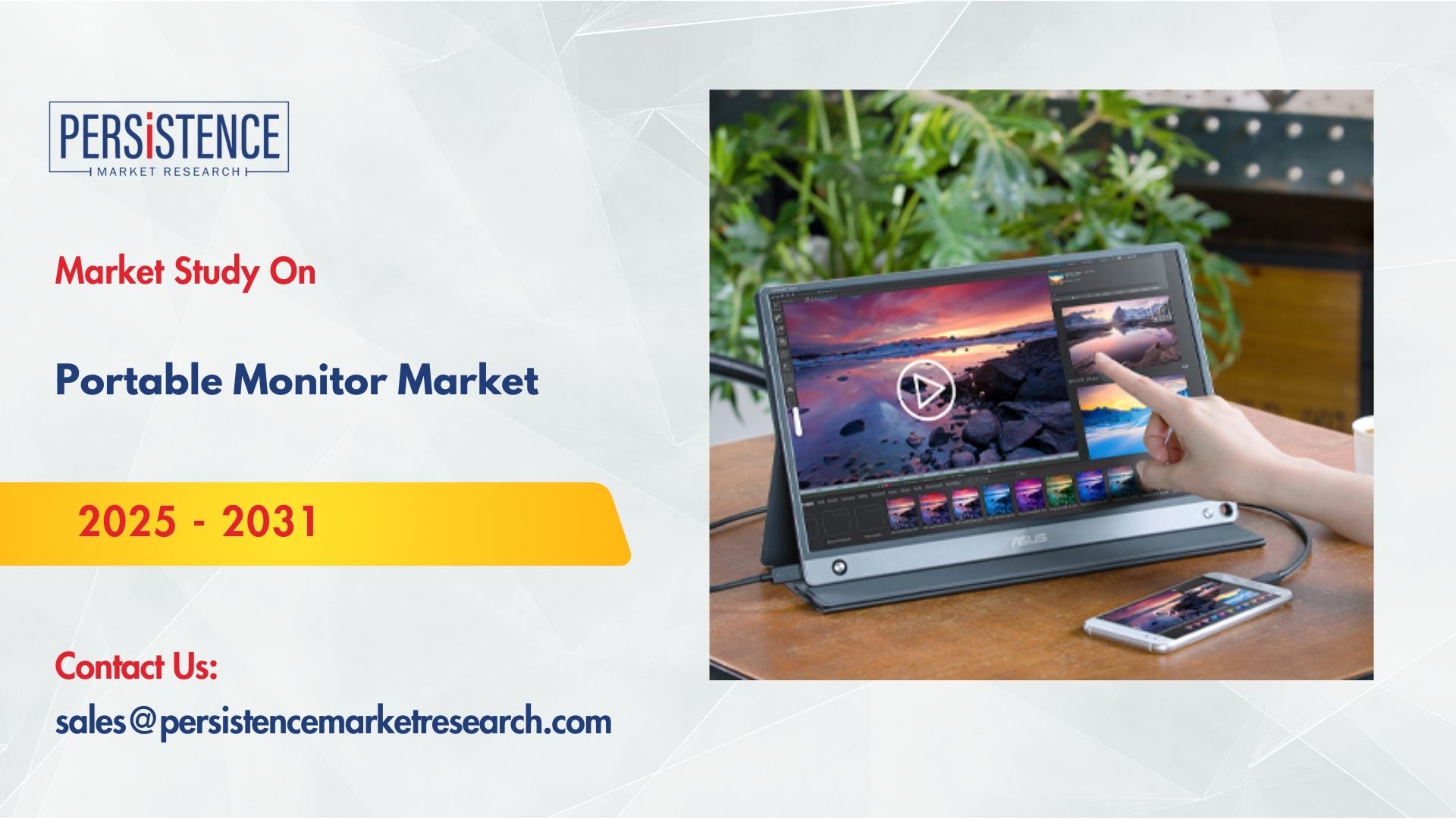 LOS ANGELES, CA, UNITED STATES, March 4, 2025 /EINPresswire.com/ -- In an increasingly mobile and remote-centric world, portable monitors have emerged as a game-changer for professionals, gamers, and everyday users alike. Offering flexibility, enhanced productivity, and convenience, these devices are becoming essential for those who need to extend their screen real estate without the bulk of traditional monitors. According to Persistence Market Research’s projections, the portable monitor market is expected to reach USD 954.2 billion by 2031, growing at a remarkable CAGR of 22.4%. This rapid growth reflects the rising demand for versatile and high-performance display solutions across various industries.