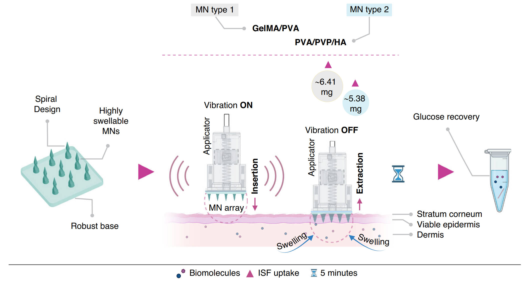 The study introduces two innovative types of spiral-shaped, swellable microneedle arrays designed for rapid interstitial fluid (ISF) extraction. The first array is composed of gelatin methacryloyl (GelMA) and polyvinyl alcohol (PVA), while the second incorporates a combination of PVA, polyvinylpyrrolidone (PVP), and hyaluronic acid (HA). These microneedles demonstrated impressive swelling ratios of 560 ± 79.6% and 370 ± 34.1% in artificial ISF within just 10 minutes, respectively.