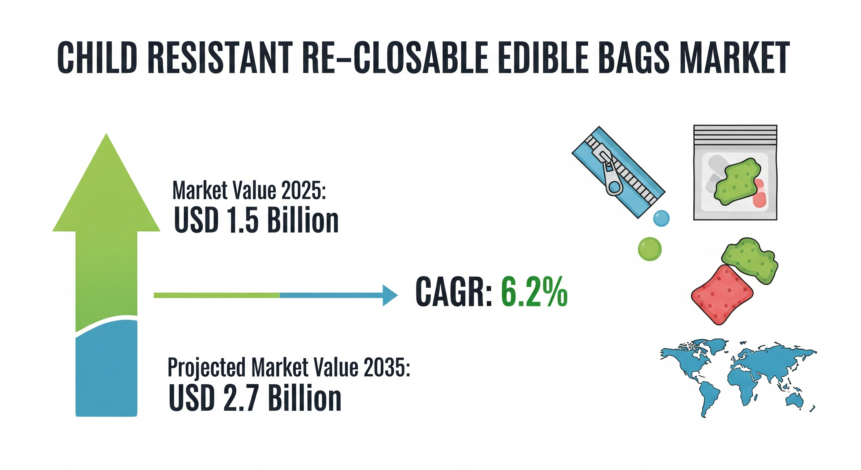 NEWARK, DE, UNITED STATES, August 8, 2025 /EINPresswire.com/ -- The Child Resistant Re-Closable Edible Bags Market, valued at USD 1.5 billion in 2025, is on track to reach USD 2.7 billion by 2035, expanding at a robust 6.2% CAGR over the forecast period. This growth is underpinned by rising global safety mandates, evolving packaging laws, and increased demand for resealable, tamper-evident, and eco-friendly packaging in pharmaceutical, cannabis, nutraceutical, and consumer goods sectors.