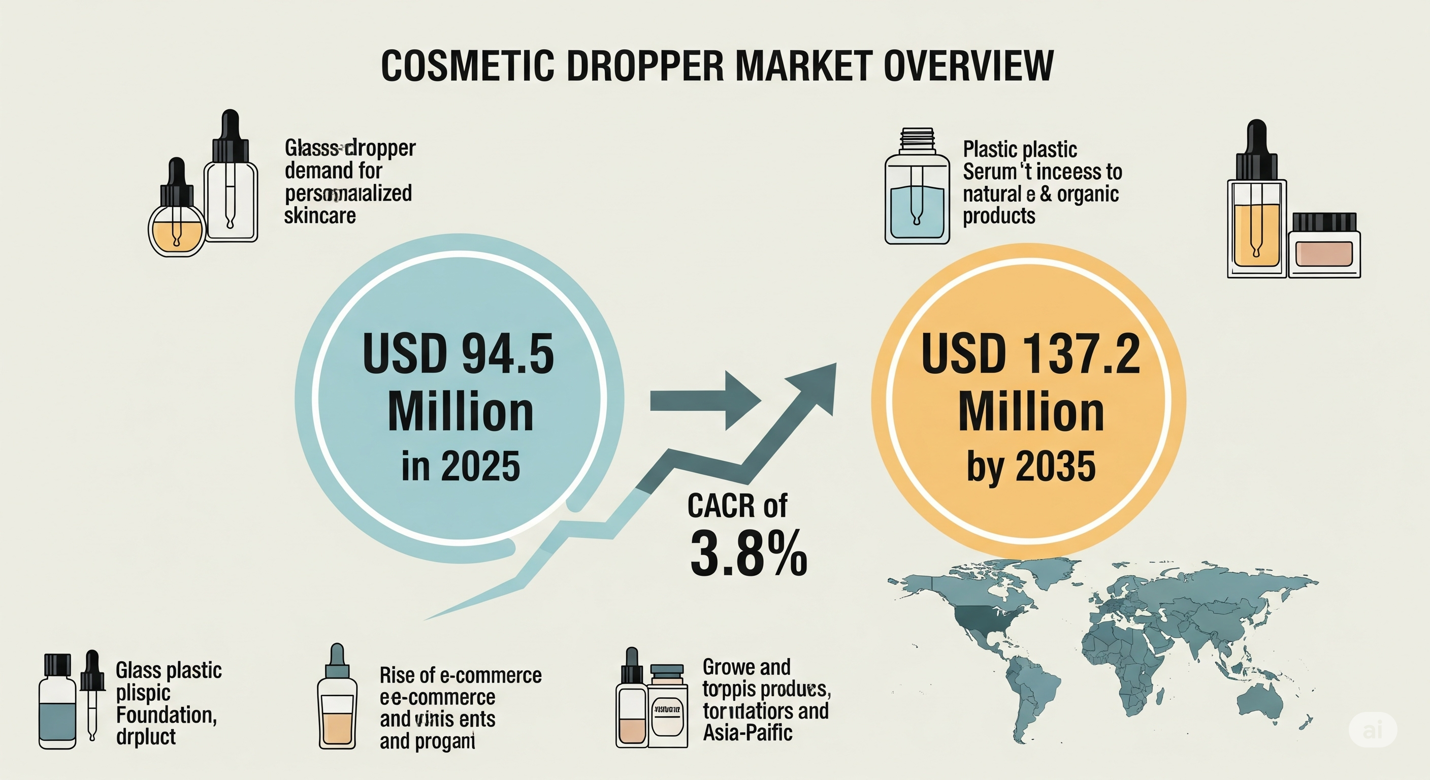NEWARK, DE, UNITED STATES, August 20, 2025 /EINPresswire.com/ -- The global cosmetic dropper market is set for a promising decade ahead, projected to expand from USD 94.5 million in 2025 to USD 137.2 million by 2035, at a steady CAGR of 3.8%. As skincare and beauty brands race to meet rising consumer expectations, droppers have become indispensable in ensuring precision dosing, formula protection, and sustainability.