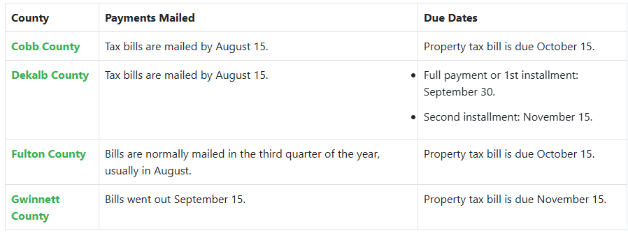 In Georgia, unlike the state of Illinois, property taxes are typically due annually, and tax bills are usually mailed out during August. Although tax payments are due in the fall, deadlines can vary by county.