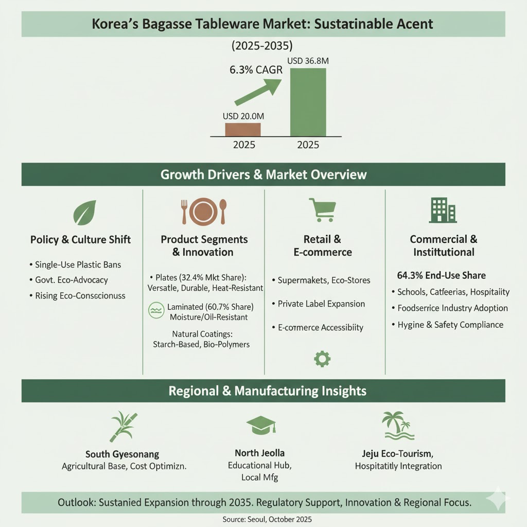 NEWARK, DE, UNITED STATES, October 15, 2025 /EINPresswire.com/ -- Demand and Trend Analysis of Bagasse Tableware Product in Korea is entering a decisive growth phase, underpinned by regulatory mandates, consumer sustainability trends, and heightened manufacturing innovation. According to new data from the latest Demand and Trend Analysis of Bagasse Tableware Product in Korea, the market is estimated at USD 20.0 million in 2025 and projected to reach USD 36.8 million by 2035, reflecting a compound annual growth rate (CAGR) of 6.3% over the forecast period.
